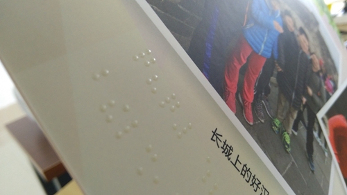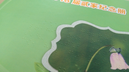 一個(gè)架子上,放著一疊厚實(shí)的精裝冊(cè)子,封面寫著“2018屆貳家紀(jì)念冊(cè)”。翻開冊(cè)子,與以往見到的一樣,紙面印著一張張燦爛而純真的笑臉和一些文字,不一樣的是,紙面上還多了一些微微凸起圓點(diǎn),大約厚度1mm左右,按一種特有的規(guī)律排列,看起來(lái)晶瑩剔透,用手撫摸一下,顆粒感很真實(shí),這就是“盲文畢業(yè)紀(jì)念冊(cè)”。